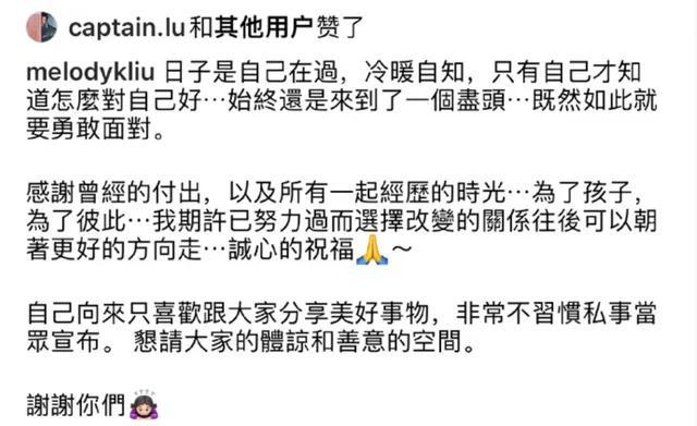 Melody称17年的婚姻走到尽头,主要是因为两人的性格、思想以及理念都有很大的差距,所以才决定结束这段婚姻。