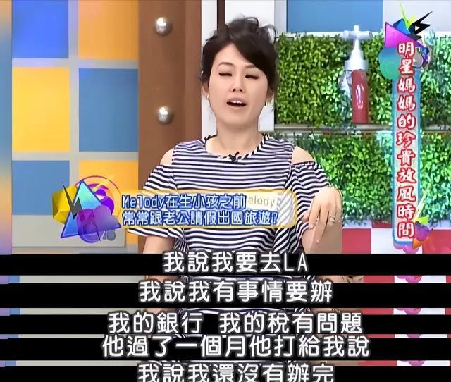 Melody曾在节目中公开吐槽老公吴育奇很爱玩,在她生第一胎的时候,老公从国外回到家,第一件事并不是照顾老婆,而是说了一句“你们都还好吧”就直接去按摩了,这让Melody气愤不已,甚至还得了产后抑郁症。Melody在怀二胎已经8个月的时候,挺着大肚子在雨中带老大看病,老公吴育奇也没有陪伴在身边。