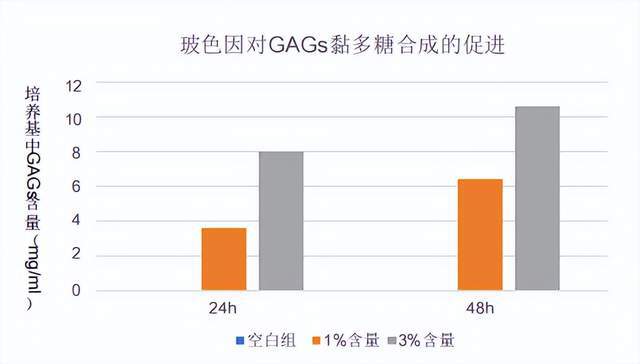 添加3%玻色因培养基中黏多糖GAGs24h增长8.0mg/ml, 48h增长10.6mg/ml,因此玻色因促进表皮细胞分泌黏多糖。