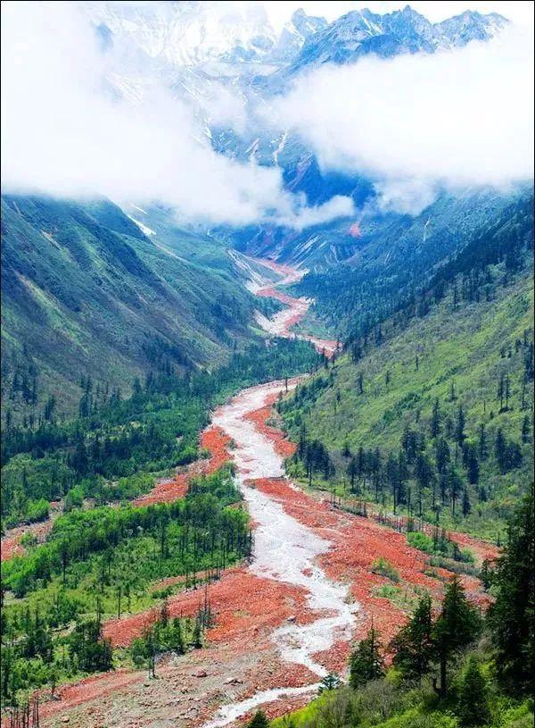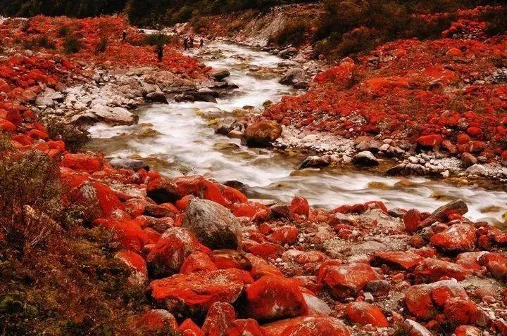 你见过红色的石头吗?在四川海螺沟景区,就有这样的红色石头,特别艳丽。