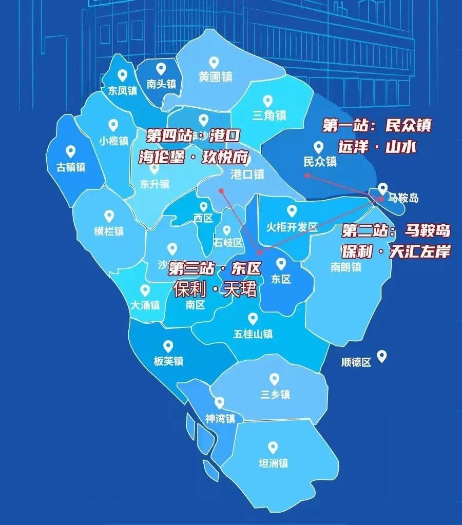 前前后后考查了三四个项目,因为最近房地产感觉各个城市都有不同程度的救市措施,同时价格都存在不同幅度的降价,所以特意来看看中山各个区价格跌了没有。下图为当天考察线路: