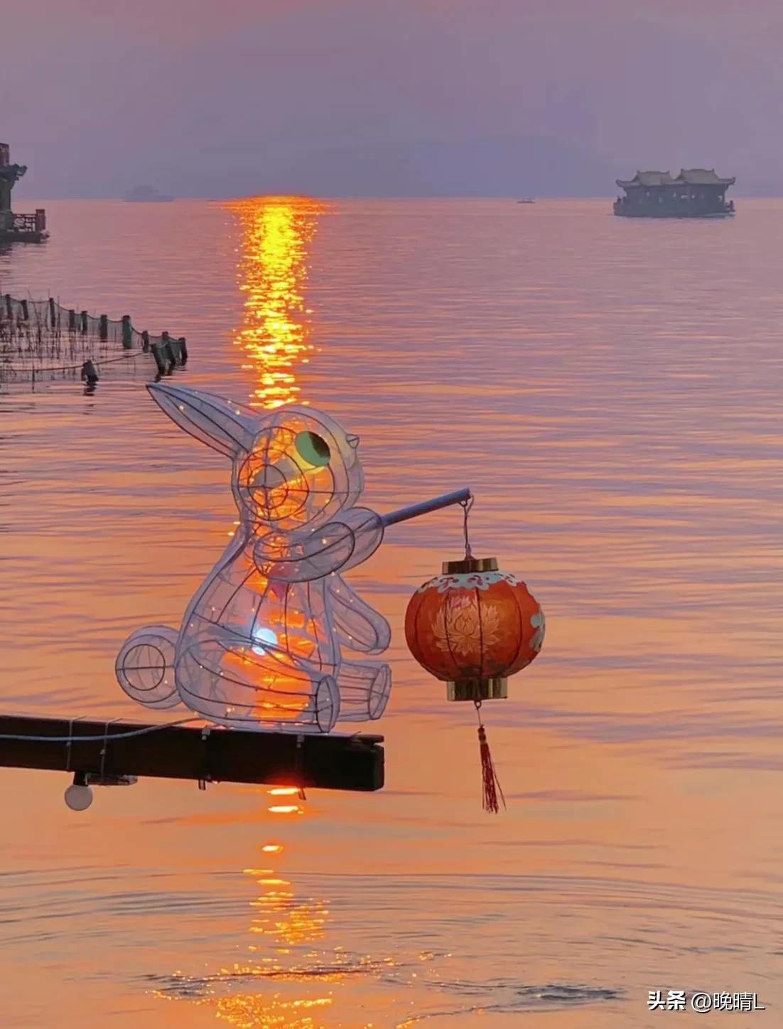 "落霞与孤鹜齐飞",西湖的兔子灯船特别有氛围感。