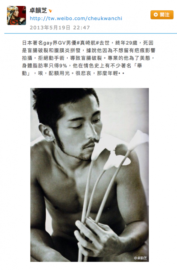 某天,在日本留学的中国同志留学生们传来消息,著名GV男优真崎航生前的男友天天先生(中国籍)在韩国车祸身故。